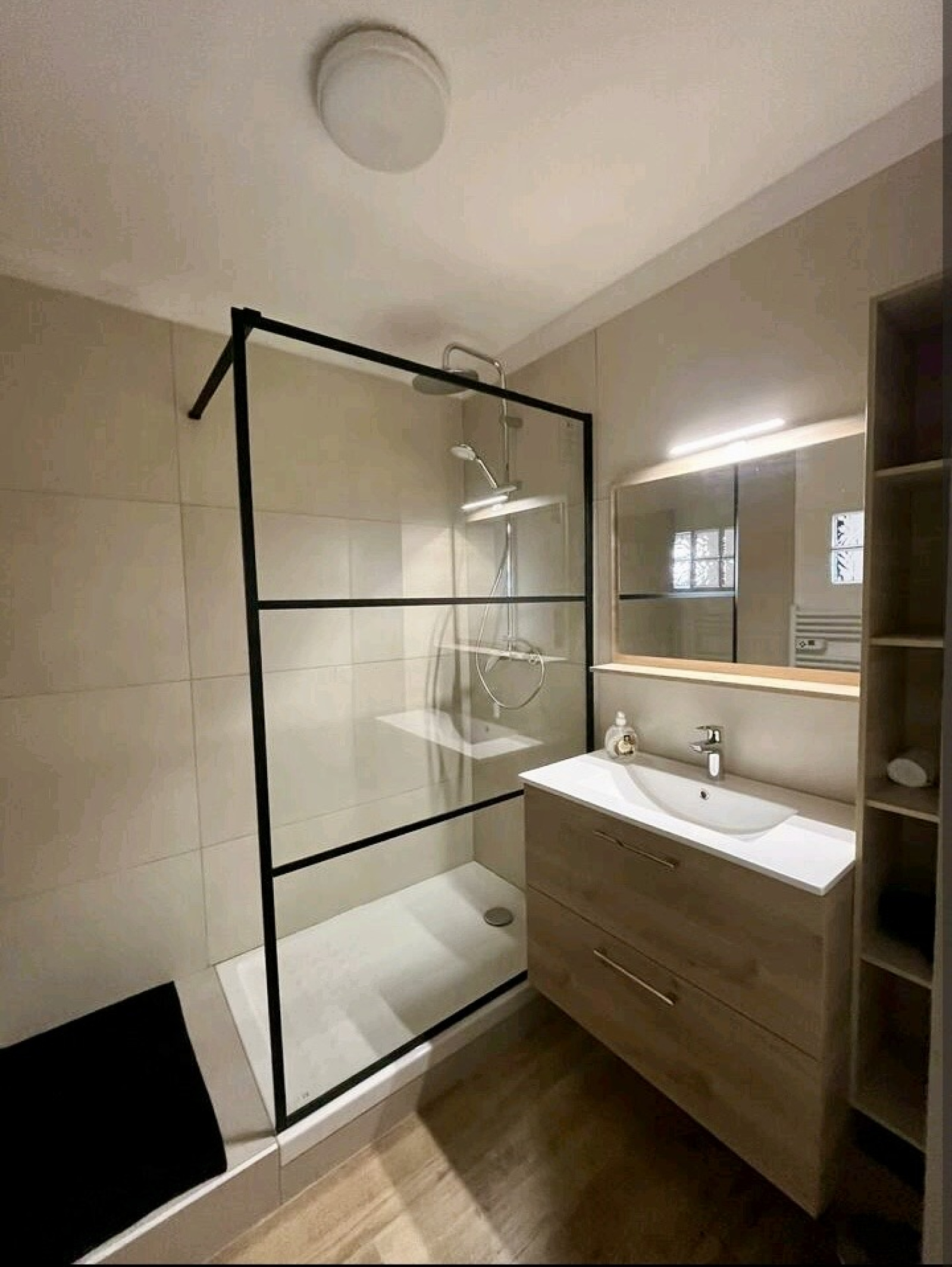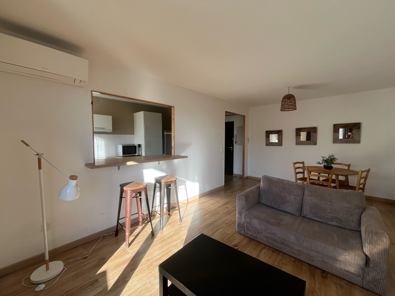 Un spacieux séjour lumineux équipé d’une climatisation réversible, ouvrant sur un balcon exposé sud-ouest avec vue dégagée ; une cuisine moderne entièrement équipée, avec comptoir ouvert sur le séjour ; une grande chambre avec meubles et nombreux rangements, également climatisée ; une salle de bain élégante avec chauffe-serviettes et apport de lumière naturelle par carreaux de verre.