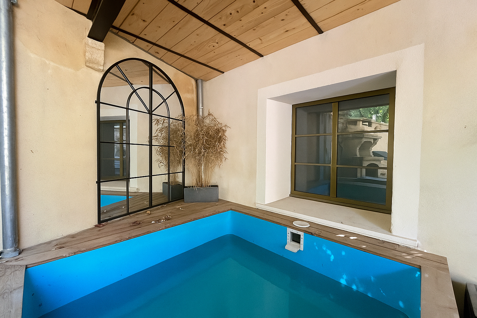 À l’extérieur, la cour ensoleillée exposée plein sud abrite un bassin chauffé, propice à la détente et aux instants partagés.