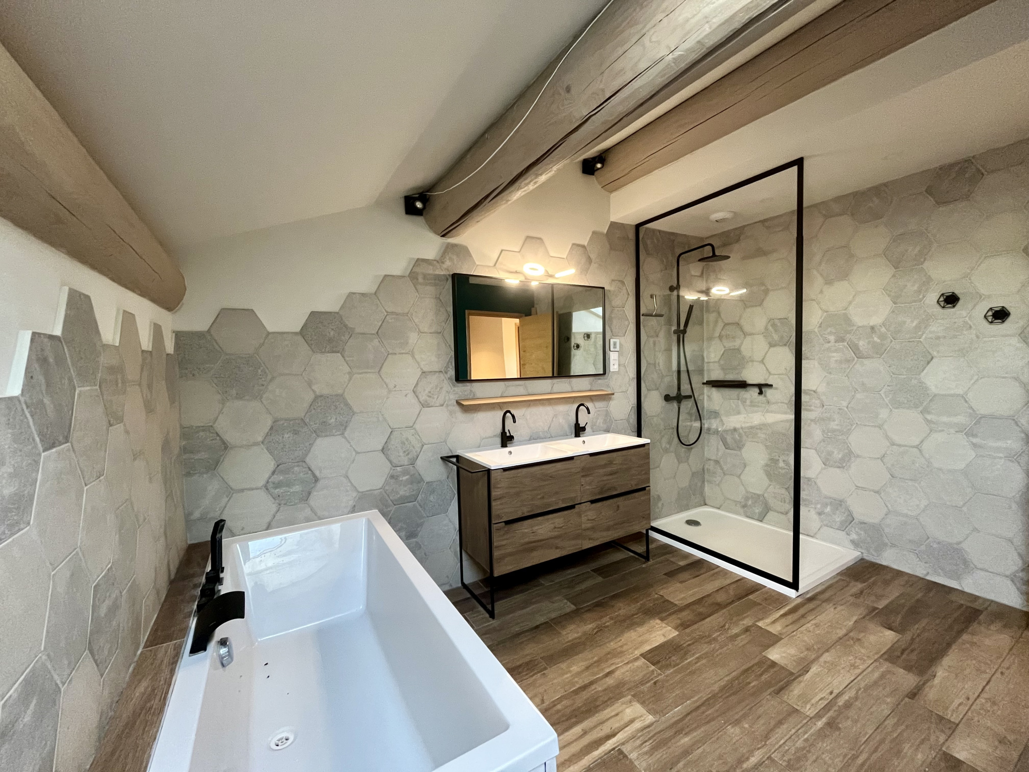 Dès l’entrée, les volumes généreux, la lumière naturelle et la noblesse des matériaux créent une atmosphère à la fois chaleureuse et raffinée.